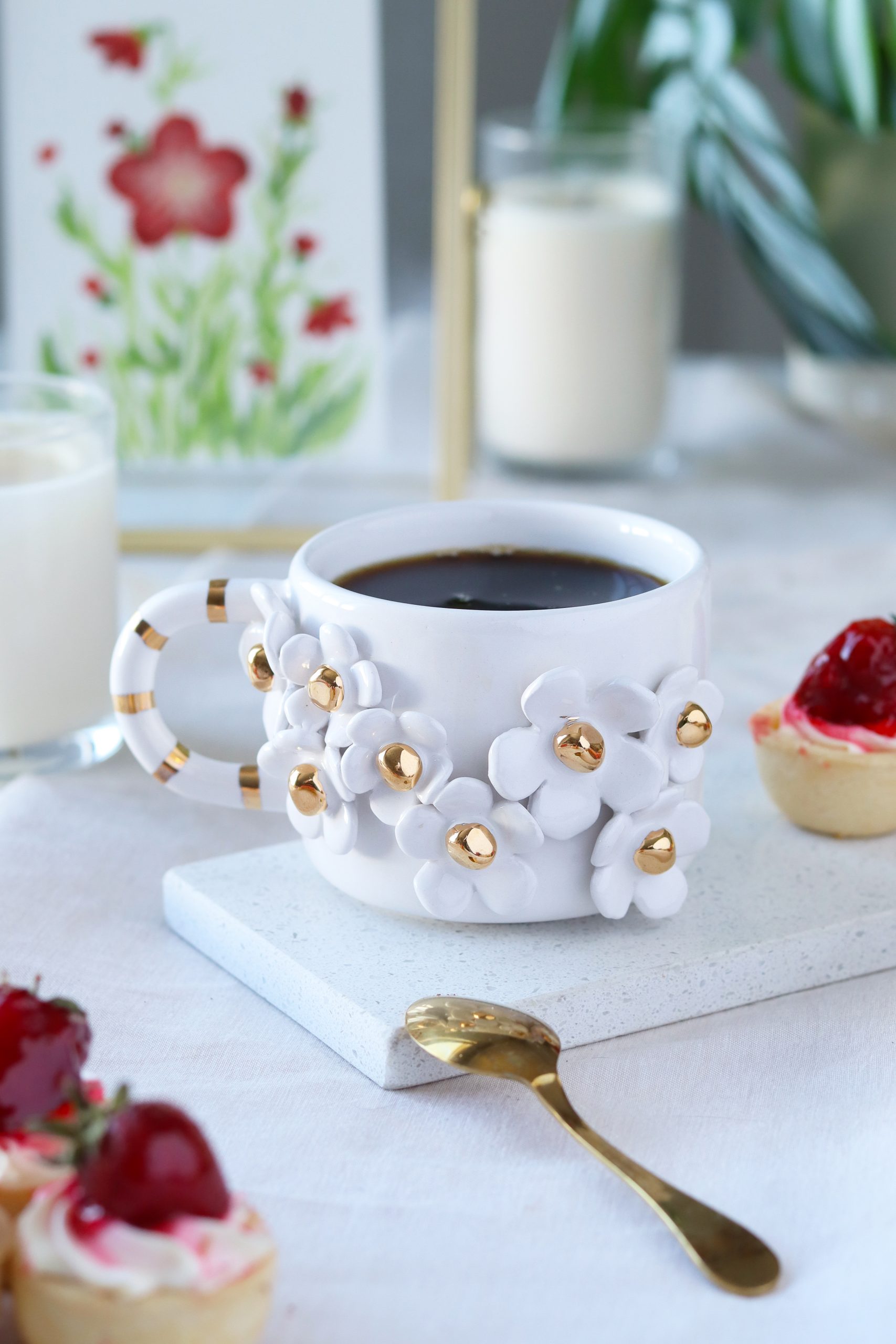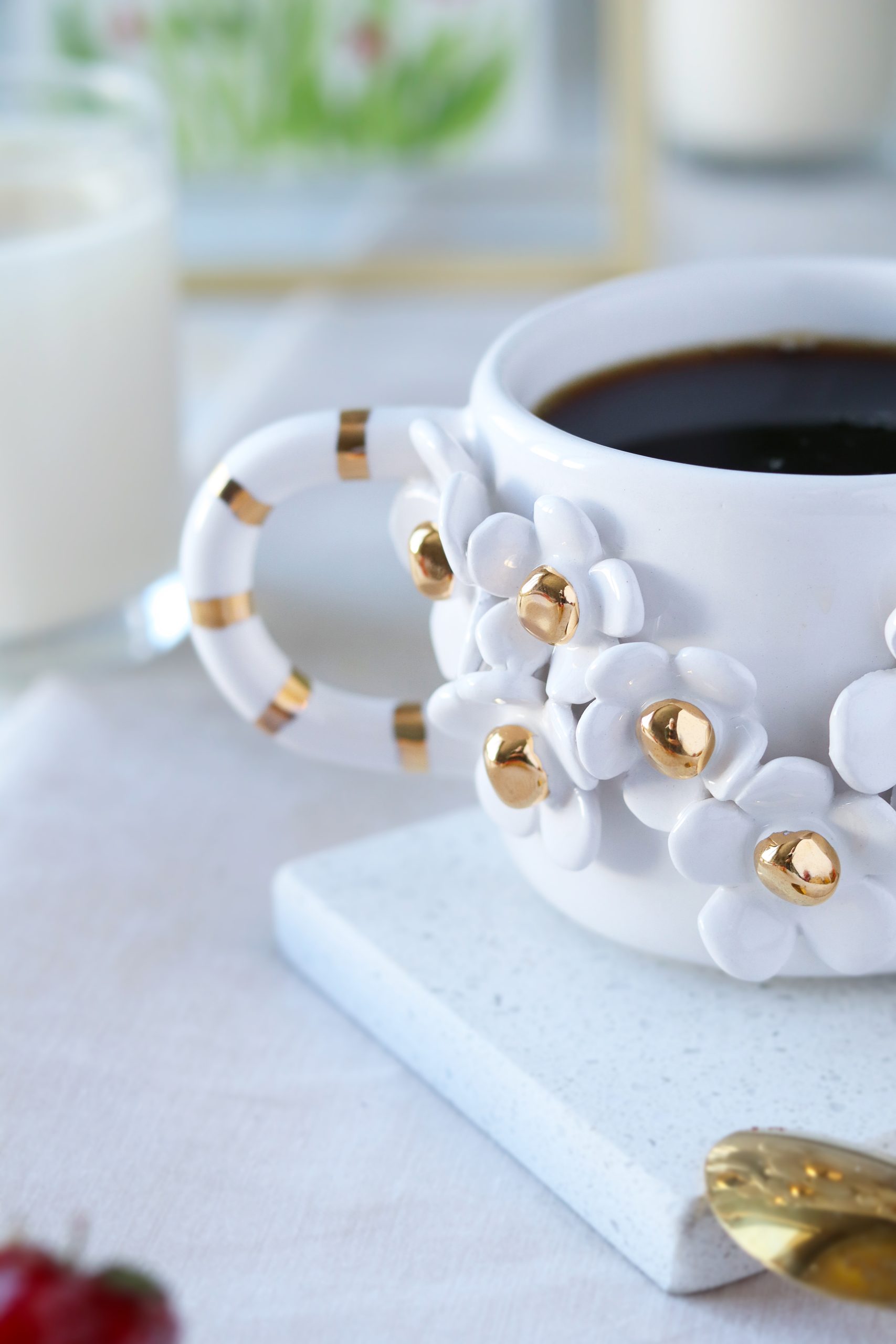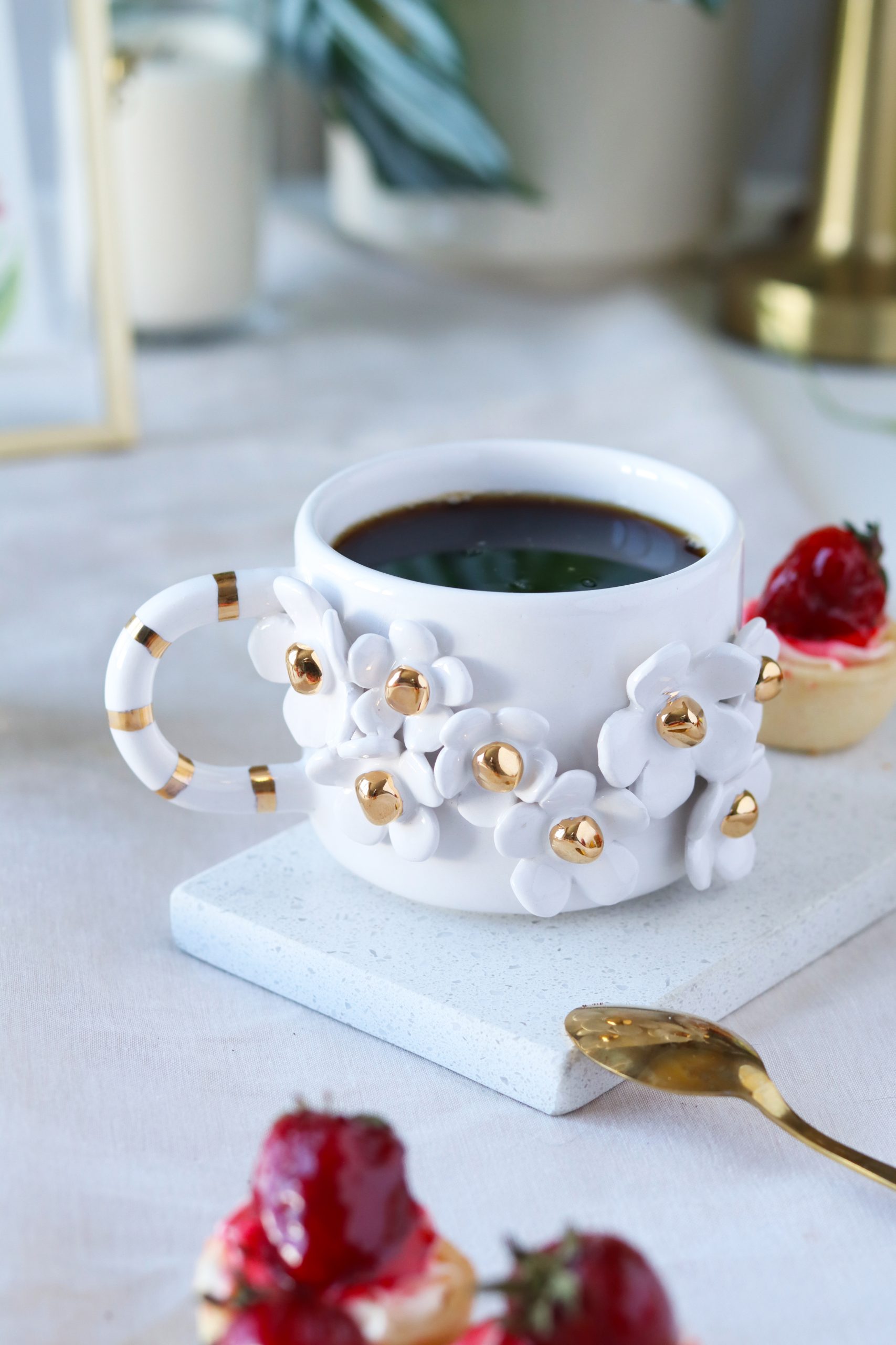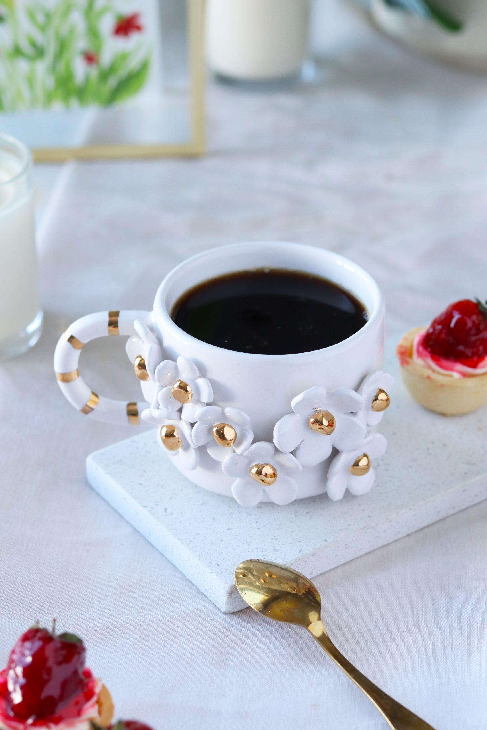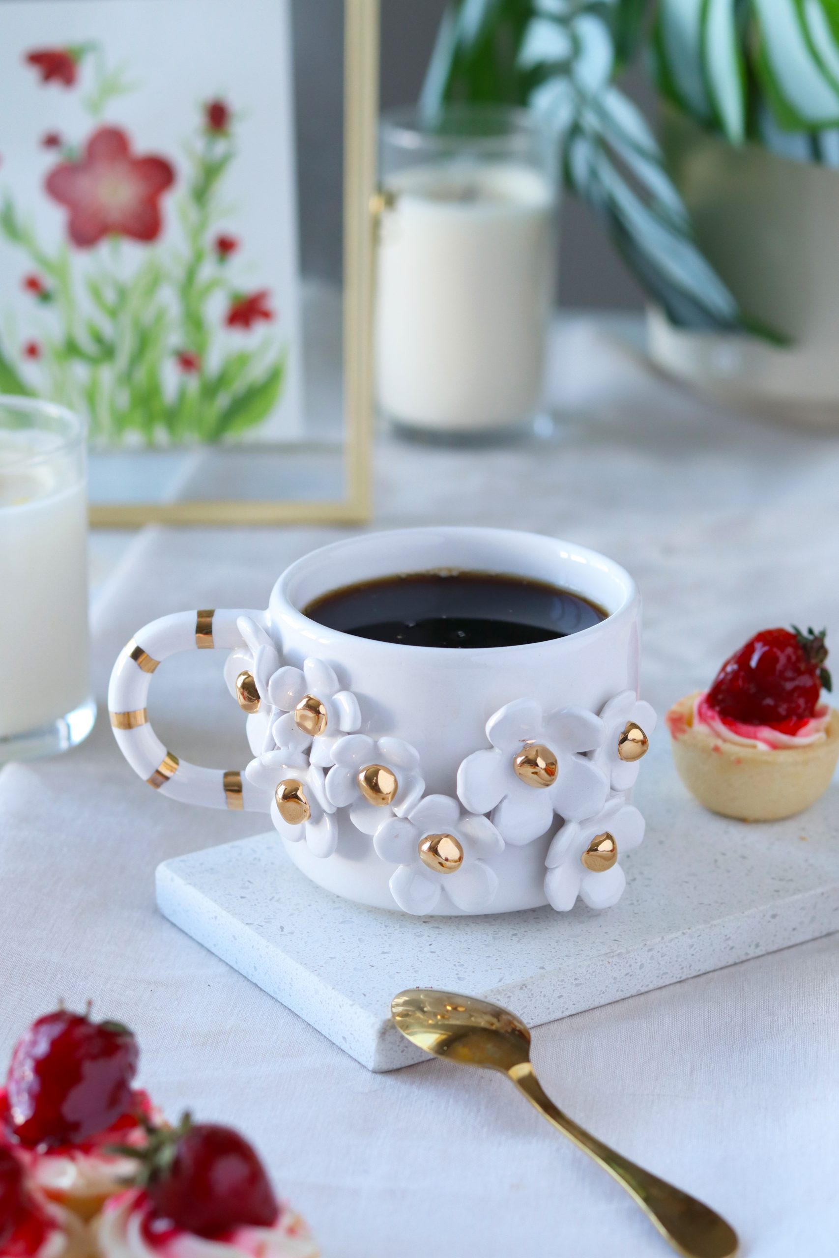 – El yapımı çiçek figürlü tasarımıyla göz alıcı bir görünüm sunar.; – 24K altın dekorasyonu ile şıklığı ve zarafeti masanızın üzerine taşır.; – 250ml kapasitesiyle günlük kullanım için idealdir; sıcak içeceklerinizi keyifle yudumlayın.; – Gıda temasına uygun olarak elde yıkama önerisiyle pratik ve hijyenik kullanım sağlar.; – Yerli üretim olup, Türk malı gururunu evinizde yaşatmanız için tasarlanmıştır.;-Seramik doğal bir üründür, natürel bir estetiğe sahiptir.; Renk farklılığı, gözenek lekesi, iğne deliği ve fırça izi gibi yüzeyindeki eşitsizlikler kalite hatası olmayıp ürünün El yapımı olmasının bir sonucudur.;