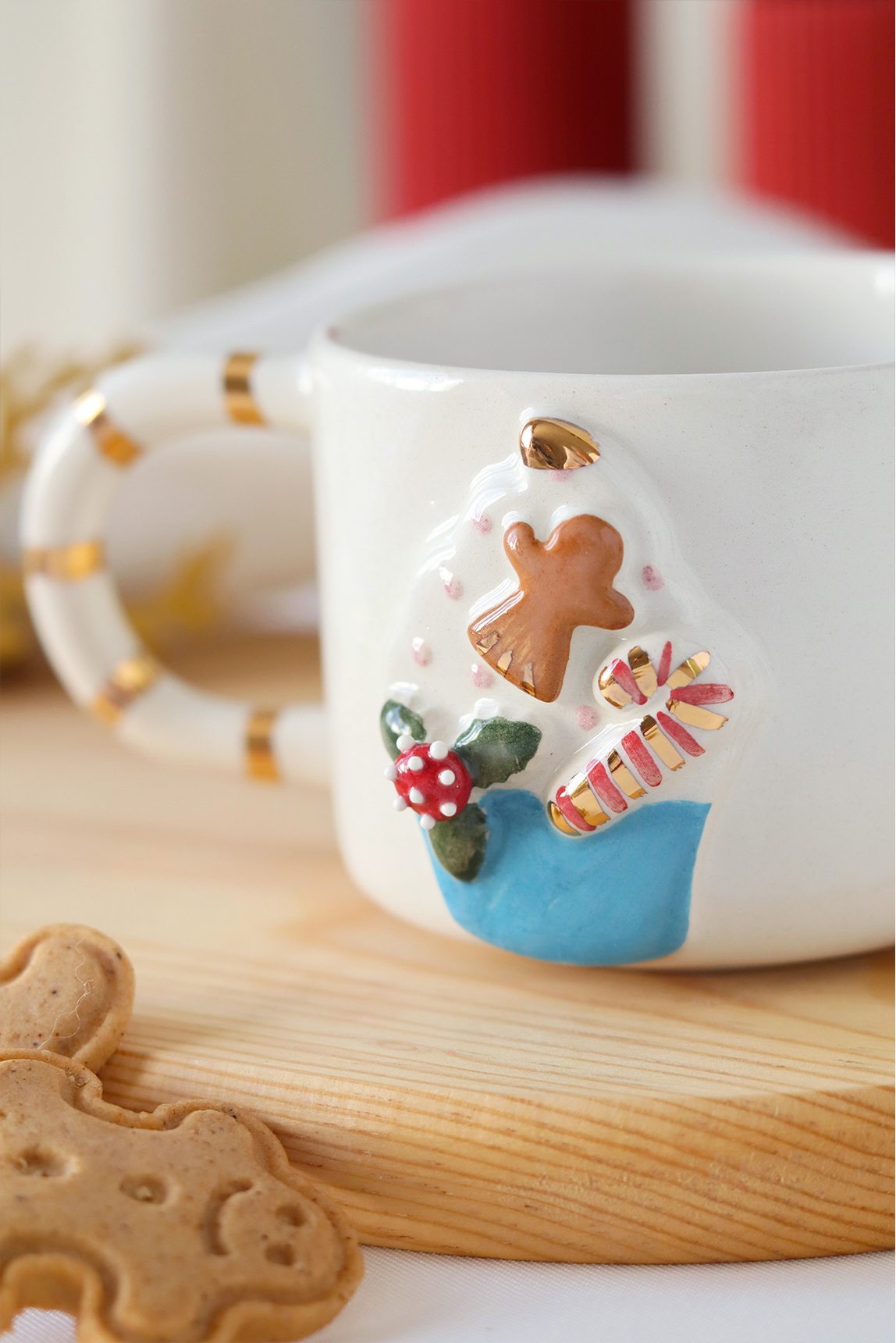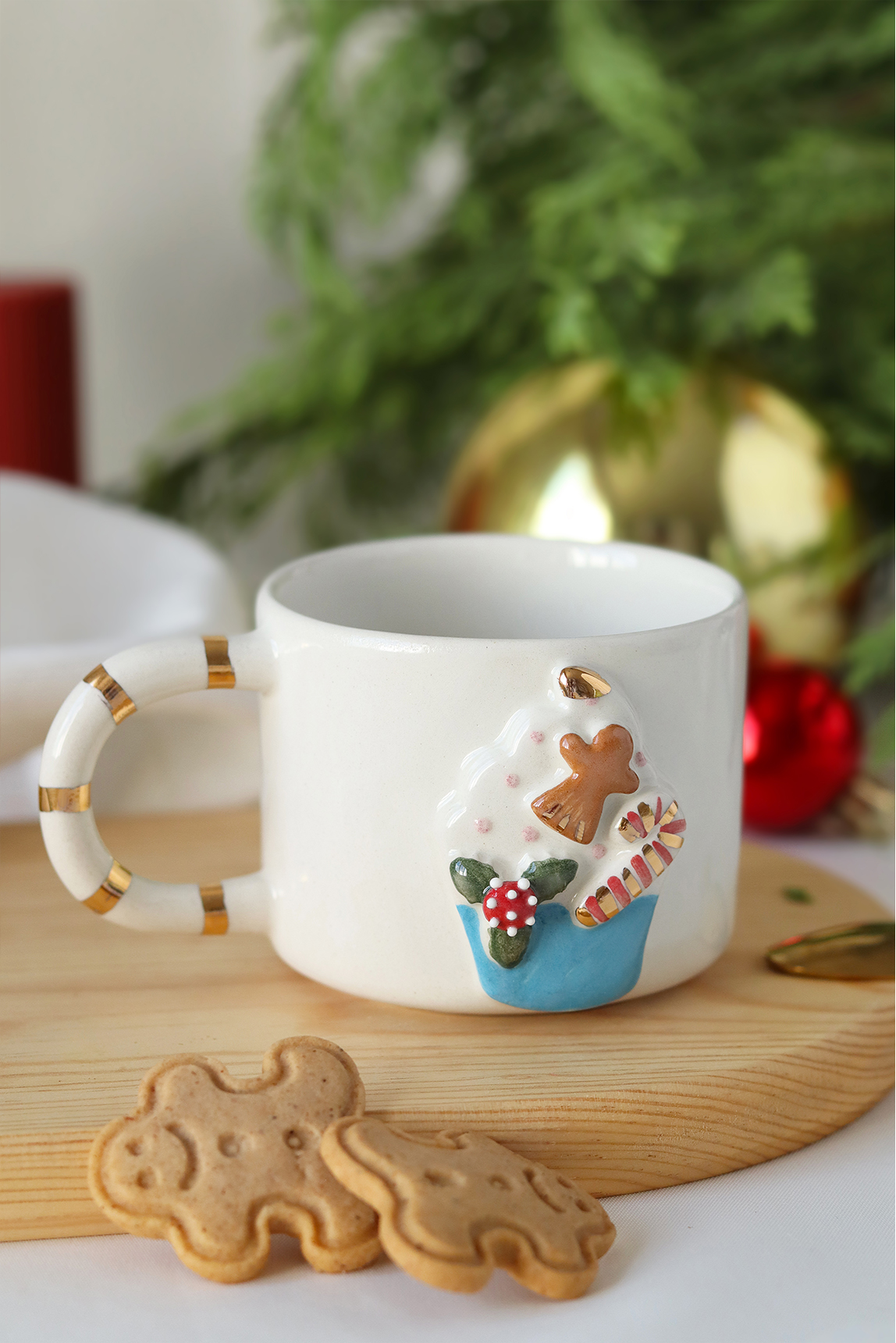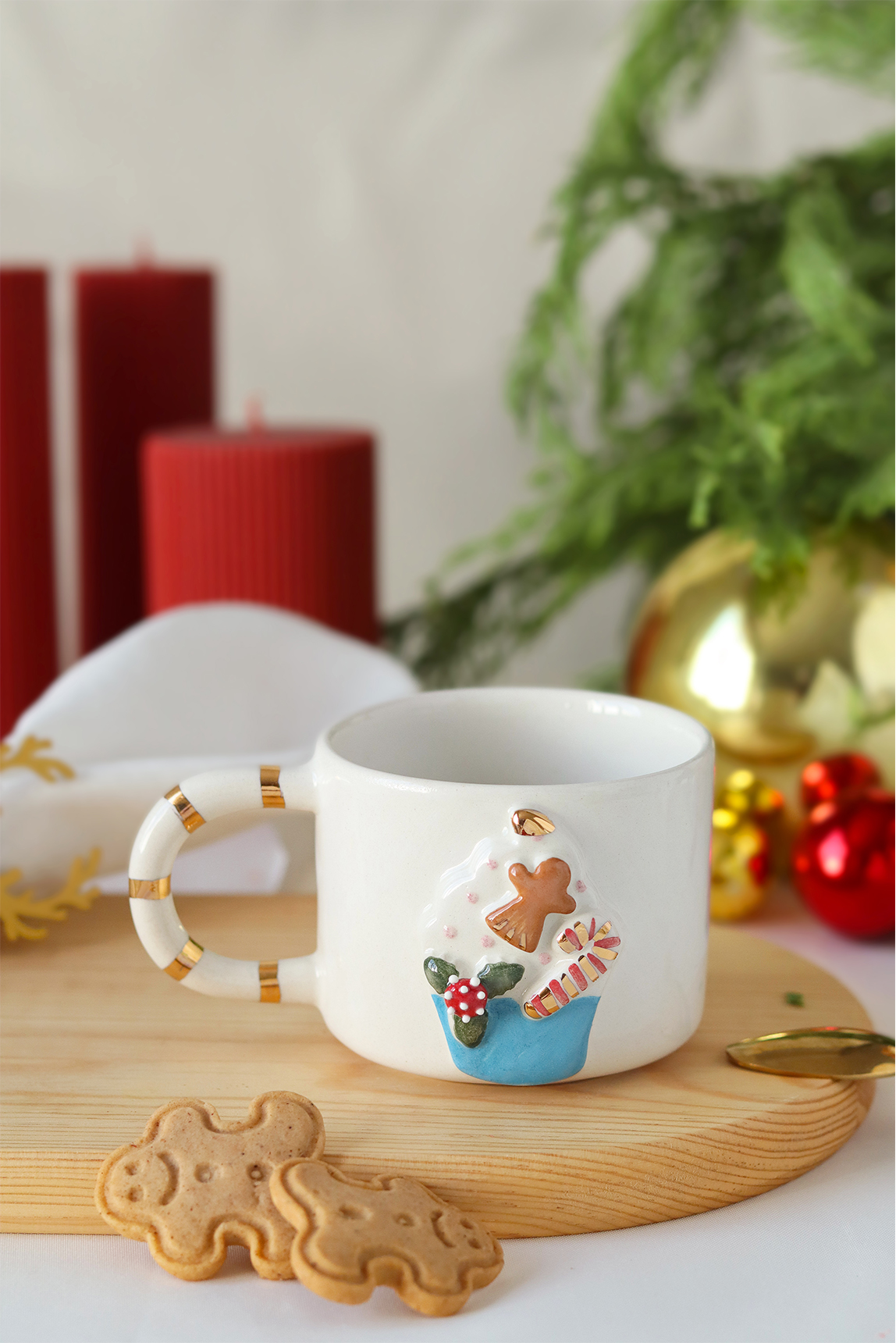 – Özel tasarımıyla dikkat çeken bu kupa, yılbaşı temalı cupcake figürleriyle süslenmiş olup, sofranızda şık bir dokunuş sağlar.; – 24K altın dekorasyonu ile göz alıcı bir parlaklık sunar ve her türlü özel gününüzde unutulmaz anlara eşlik eder.; – El yapımı seramik malzemesi sayesinde hem dayanıklı hem de estetik bir kullanım deneyimi yaşatır.; – Kolay bakım imkanı sağlayan elde yıkama özelliği ile pratiklik kazandırırken, gıdaya uygun materyaliyle güvenle kullanabilirsiniz.; – 200 ml hacmiyle ideal boyutta olan bu kupa, içeceklerinizi keyifle yudumlayabileceğiniz ideal ölçülerdedir.; – Yerli üretim olmasıyla gurur duyulan bu ürün, Türk mutfak kültürünün zenginliğini evinize taşır.; -Seramik doğal bir üründür, natürel bir estetiğe sahiptir.; Renk farklılığı, gözenek lekesi, iğne deliği ve fırça izi gibi yüzeyindeki eşitsizlikler kalite hatası olmayıp ürünün El yapımı olmasının bir sonucudur